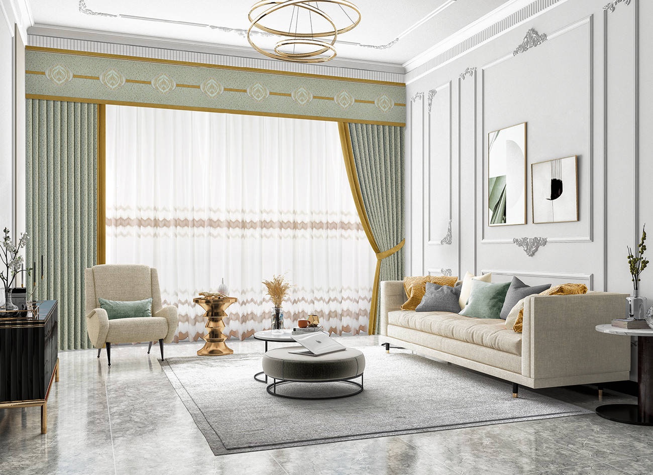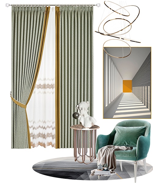 略帶灰調的綠色就像籠罩著霧氣的森林,視覺上明凈舒爽。花崗巖般的紋理賦予面料獨特的斑駁印跡,做舊的設計帶著獨特的懷舊腔調。